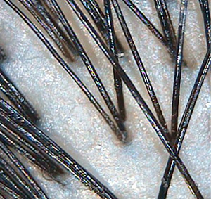 | 체열이 올라감에 따라 세포 대사가 빨라져 모발의 생존주기가 짧아짐. 점점 더 힘없고 가는 모발이 자라게 되며, 모발 개수 또한 감소됨. | 모공당 2~3가닥으로 정상 굵기의 건강한 모발이 자람. |
