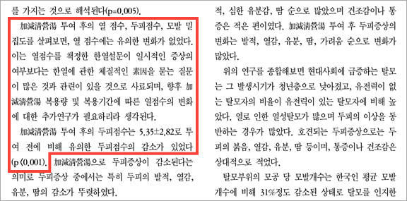 두통, 안면홍조, 다한증, 눈충혈, 안구건조, 구건, 구취, 구내염, 비염, 축농증, 입면장애, 천면, 다몽, 불면 등